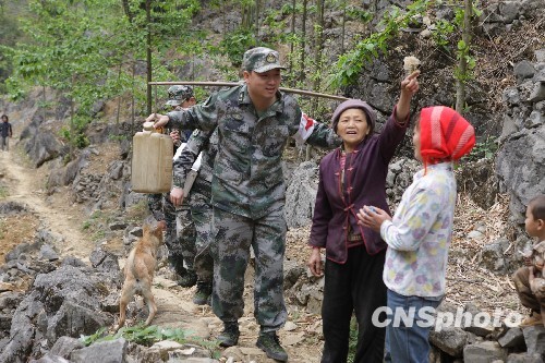 解放军三○三医院组织的博士医疗队来到广西河池市东兰县三弄乡全洞村和三核村,采取一人帮一户的方式为灾民送水,并为身体不适的村民免费看病。中新社发 夏志勇 摄