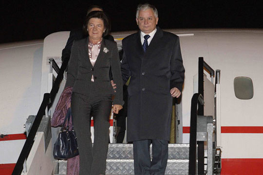 资料图为2008年11月5日,波兰总统卡钦斯基及夫人乘坐图-154飞机抵达斯洛文尼亚的卢布尔雅那。