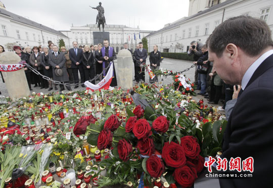 波兰总统卡钦斯基乘坐的飞机10日在俄斯摩棱斯克失事,波兰总统卡钦斯基已经确认死亡。图为波兰华沙总统府前,民众纷纷拿着鲜花悼念身亡的总统。