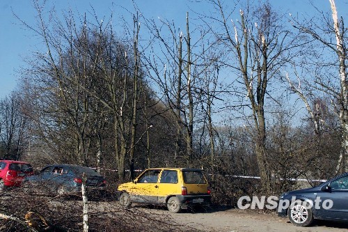 4月10日,波兰总统乘坐的飞机在俄罗斯斯摩棱斯克州一军用机场降落时失事,包括波兰总统卡钦斯基在内的97人全部丧生。图为被失事飞机削断的树木现场,折断处清晰可见。 中新社发 田冰 摄