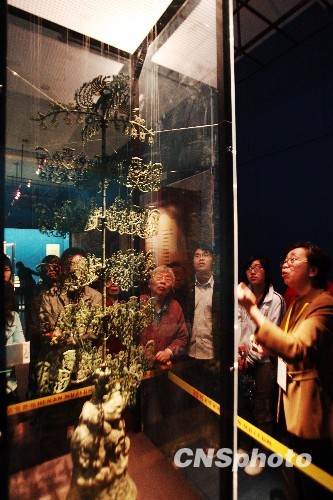4月11日,绿釉陶座铜摇钱树在郑州河南博物院展出。该摇钱树陶质台座上浮雕天禄、辟邪神兽,青铜制做的树身由树杆、树叶和树顶端的朱雀组成,树杆分6节,上挂大小叶片64片,树枝上有西王母和独角兽、五铢钱等,是汉代升仙思想的反映。中新社发 王中举 摄