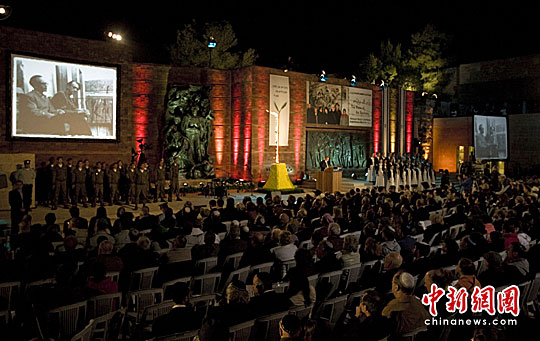 在以色列亚德韦希姆大屠杀纪念馆,人们参加二战大屠杀纪念活动开始仪式。