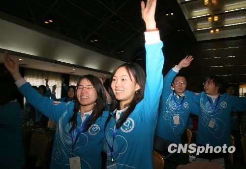 4月13日,世博会北京志愿者开始在北京做上岗前的热身的培训。完成培训后,第一批志愿者将于4月17日奔赴上海,参加世博会试运行。北京志愿者将主要服务世博会北京馆,共300人,其中相当一部分参加过奥运会的志愿服务。图为志愿者在练习“互动礼仪”。中新社发 苏丹 摄
