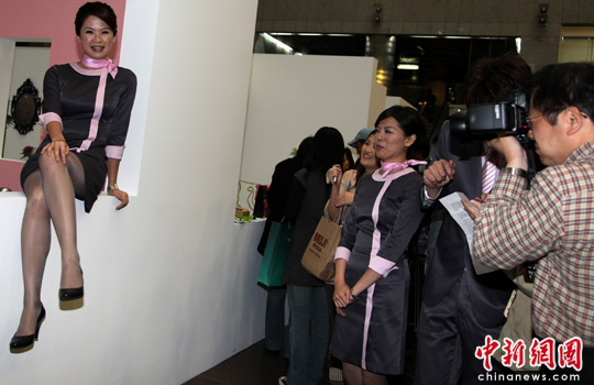 图为市政府系统的一名女性工作人员,身穿灰色搭配粉色的A字型裙装,出人意料“攀高”展示,成为现场的花絮和焦点。中新社发 董会峰 摄