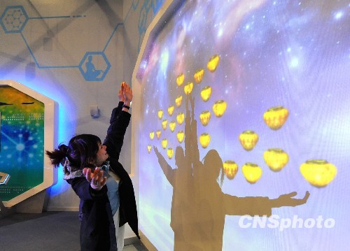 上海世博会浦西园区信息通信馆,讲解员演示触摸技术。中新社发 远舟 摄