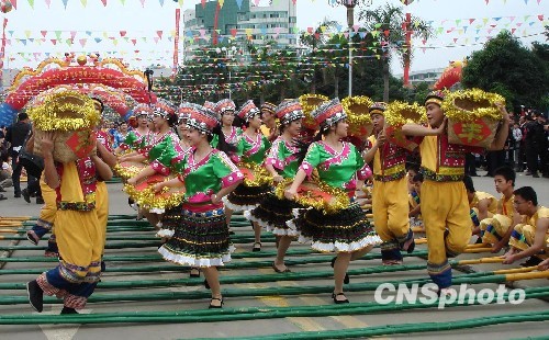 “中国壮乡”广西南宁武鸣县一千多名身着鲜艳民族服装的壮族男女,在一千多米长的竹杆阵内,和着鼓声欢跳竹杆舞。中新社发 黄艳梅 摄