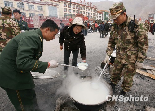 4月16日,青海省玉树藏族自治州玉树县地震发生第三天,为确保受灾民众有饭吃、有帐篷住,玉树城内各个安置点架起锅灶为受灾民众分发免费食物并帮助搭建帐篷。4月14日07时49分许,青海省玉树藏族自治州玉树县(北纬33.1,东经96.7)发生7.1级地震。
