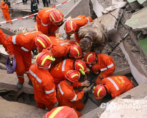 4月16日,青海省玉树藏族自治州玉树县地震发生第三天,地震灾区各个救援点正在垮塌现场紧张抢救被埋民众。4月14日07时49分许,青海省玉树藏族自治州玉树县(北纬33.1,东经96.7)发生7.1级地震。