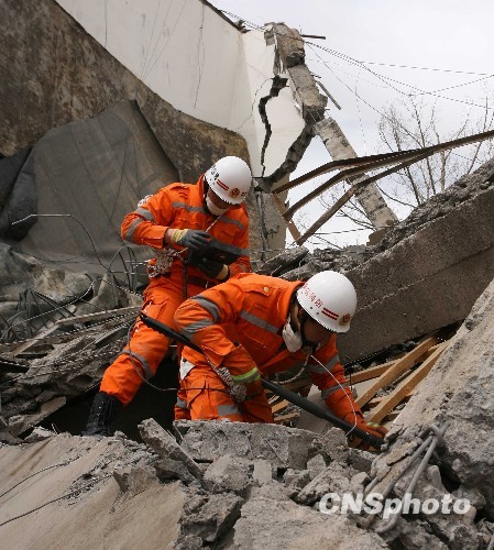 图为青岛消防部队的官兵正在救援现场搜救。中新社发 刘忠俊 摄