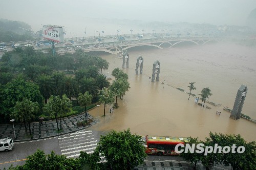 近日桂林连降大到暴雨,4月20日12时24分,漓江水位达到147.14米,超过警戒水位1.44米,流量为3390立方米/秒,是今年第一次最大洪峰,造成桂林市区部分低洼地带内涝,影响城市交通和民众生活。据桂林气象部门预报,未来两天内,受冷空气影响,仍将有大雨局部暴雨过程。中新社发 唐梦宪 摄