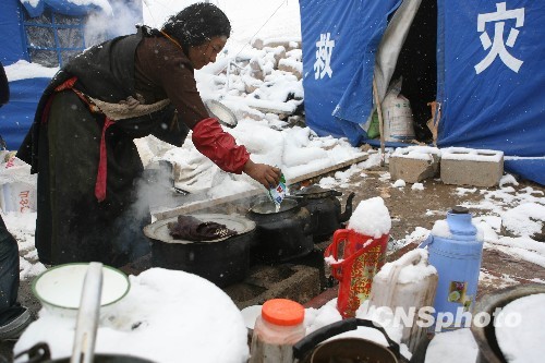 4月22日,青海玉树震区降下大雪,一位当地妇女在雪中为家人熬制奶茶。中新社发 苏丹 摄