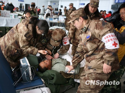 4月22日,参与青海玉树抗震救灾的救援队和部队官兵10多人因高原反应被紧急送往机场转运西宁救治。图为一名参与玉树抗震救灾的解放军士兵因严重的高原反应引发脑水肿、肺水肿。中新社发 刘忠俊 摄