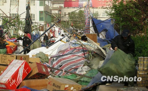 商贩正在吐鲁番市旅游文化广场边被大风毁坏的小商品市场清理货物。中新社发 姜浩 摄