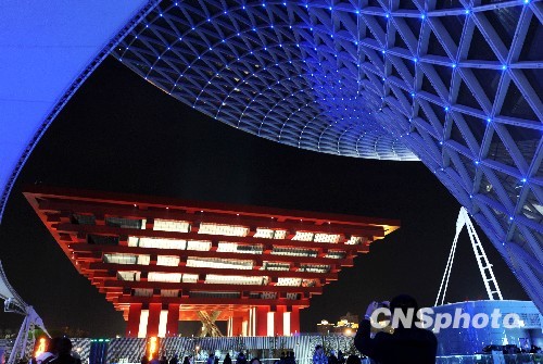 4月24日,上海世博园区内的灯光照明吸引许多游客驻足欣赏。上海世博会开幕在即,各场馆纷纷亮灯调试,璀璨绚烂的灯光效果将世博园区映照得流光溢彩、分外迷人。