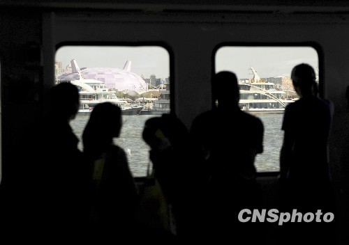 5月3日,上海世博园,游客乘船前往被称为“紫蚕岛”的日本馆,该馆外覆盖超轻的发电膜,采用特殊环境技术,是一幢“像生命体那样会呼吸、对环境友好的建筑”。中新社发 廖攀 摄