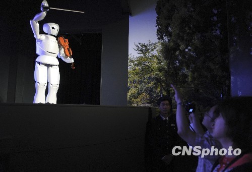 5月4日,上海世博园日本馆,观众为演奏小提琴的机器人喝彩。中新社发 廖攀 摄
