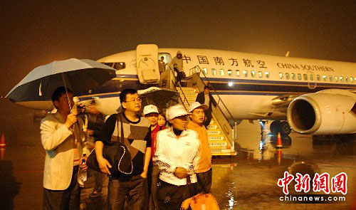 5月5日凌晨,一架刚刚抵达北京首都国际机场的航班的乘客冒雨等待摆渡车。中新社发 侯宇 摄