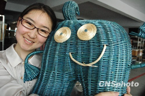 5月4日,女大学生邱子燕展示用柳条编织的低碳“海宝”。柳编制品是可降解、可回收利用的低碳环保产品,返乡后在柳编加工企业就业的女大学生邱子燕利用山东省临沂市临沭县丰富的柳编资源设计编织了世博会吉祥物“海宝”,寄托一位中国人对世博会在中国举行的喜悦之情。中新社发 吕永国 摄