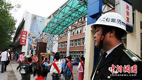 5月5日,河南郑州一小学门前,安保人员升级确保校园安全。