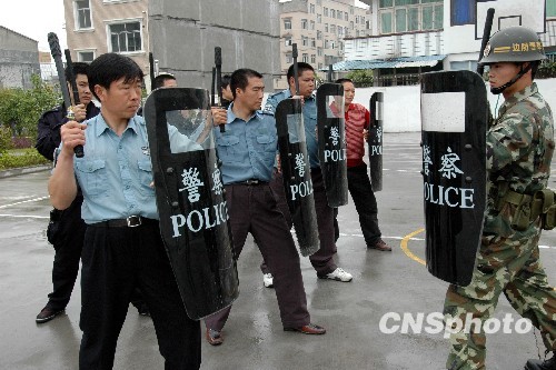 5月5日,针对近期接连发生的校园安全事件,浙江省温州市灵昆边防派出所组织辖区13所中小学校的保安人员开展防暴技能训练,有效提高学校对不法侵害行为的防护能力。中新社发 吴水斌 摄