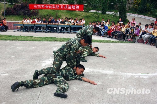 图为身着迷彩服的边防官兵为师生、学校保卫人员演练擒敌拳,并传授对敌过程中自我防卫、控制对方的一些基本技巧。中新社发 张丽君 摄