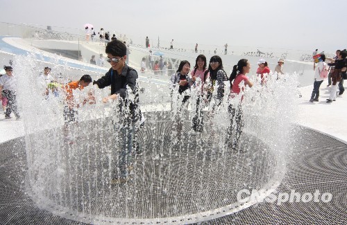 2010年5月4日,上海世博园区高温持续不断,组织方和参展场馆想了不少招,游客充分利用这些设施,有的游客在喷泉中降温,有的游客在充气遮阳伞下纳凉。