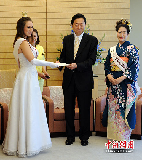 5月6日,日本东京,来自美国威斯康辛州的“樱花女王”Margot Pfefferle将美国总统奥巴马给日本首相鸠山由纪夫的一封信送达鸠山由纪夫官邸。