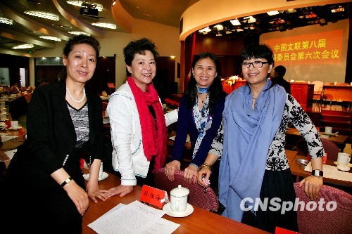 中国文联知名女委员殷秀梅、关牧村、王馥荔、邓宝金会前合影留念。中新社发 王保胜 摄