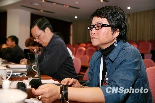 著名导演胡玫快速记录下会议内容。中新社发 王保胜 摄
