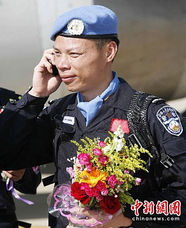 参加海地维和的93名云南边防武警官兵乘坐飞机返回昆明。中新社发 刘冉阳 摄