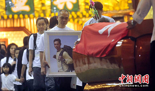 黄福荣的灵柩盖上特区区旗。中新社发 谭达明 摄