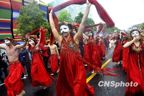 5月9日下午,上海世博会“欧洲日”特别庆典在上海世博园举行,盛装大巡游在雨中拉开了庆典帷幕。来自意大利、荷兰、波兰、希腊、比利时等23个欧盟各成员国的传统艺术团共500多名艺术家和演员组成庞大巡游队伍,为游客呈现一台汇集全欧洲各国风情的盛装表演。 中新社发 吴元峰 摄