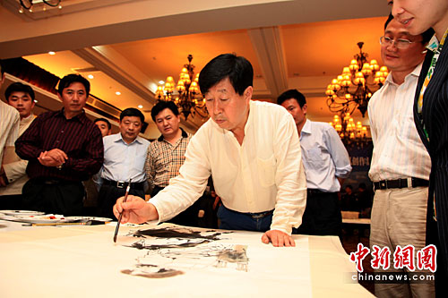 中国美协主席刘大为现场挥毫泼墨。中新社发 王保胜 摄