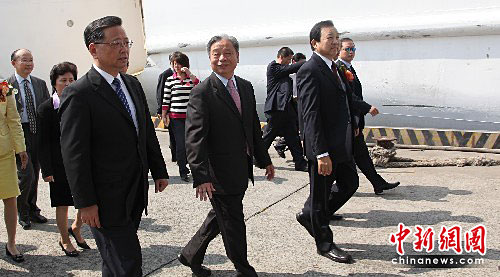 福建省长黄小晶(左一)率福建经贸文化交流团一行考察台湾高雄港。中新社发 罗钦文 摄