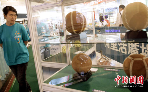 2010南非世界杯开幕前,香港举办的《世界足球》历史珍藏展将于5月15日正式对市民展出,展览展示中国古代蹴鞠、藤球及现代足球等展品。中新社发 张勤 摄