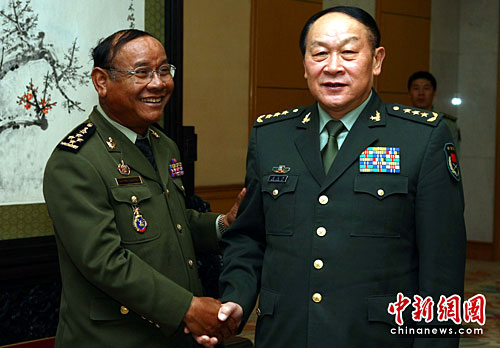 国务委员兼国防部长梁光烈上将,5月11日在北京八一大楼会见柬埔寨王家军总司令波尔沙伦上将,双方在友好的气氛进行了会谈。