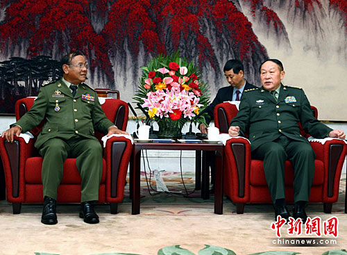 国务委员兼国防部长梁光烈上将会见柬埔寨王家军总司令波尔沙伦上将。中新社 宋吉河 摄