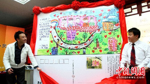 5月11日,汶川大地震两周年前夕,灾区儿童手绘明信片展览义卖暨心灵基金成立仪式在北京图书大厦启动。中新社发 富田 摄