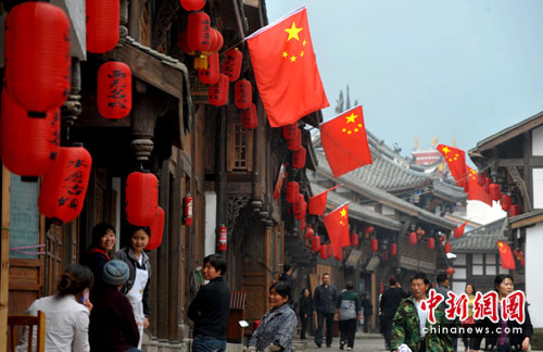2010年5月12日,“5.12”汶川特大地震发生两周年,经受了大地震毁城之殇的北川、汶川、绵竹、青川、什邡等地改颜换貌,新校舍、新住房、新厂房一栋栋林立而起。图为探访水磨新城,禅寿老街到处红旗飘飘一排繁华景象。