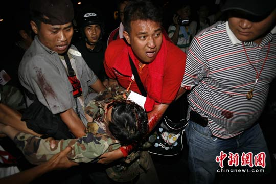 13日晚,泰国军方出动装甲车和狙击手封锁红衫军示威地点,并截水截电,企图逼走示威者。红衫军营地之后传出连串枪声和至少4下爆炸声,据报造成至少1死20伤,其中支持红衫军的陆军少将卡迪亚头部中枪昏迷。