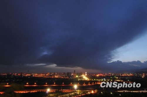 5月16日傍晚,新疆库尔勒上空突然出现一团乌云,造型十分接近“龙卷风”的造型,引来众多游人观看。这“龙卷风”式云型的奇观持续约40分钟。 中新社发 确·胡热 摄