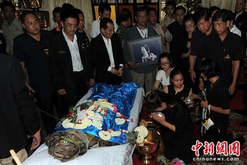5月17日,“红衫军”在曼谷一所寺庙为13日受伤后不治身亡的领导人卡迪亚·萨瓦滴蓬举行葬礼。