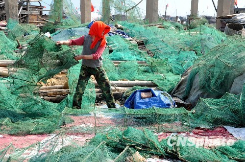 5月25日,江苏连云港渔港码头,渔民在做进入休渔期的准备。中新社发 王春 摄