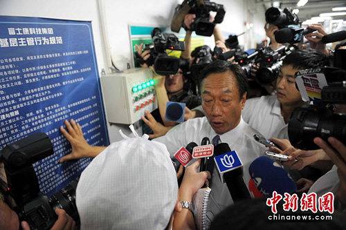 5月26日上午,富士康科技集团总裁郭台铭会见海内外200多名媒体记者,并主动带记者参观社区、厂区、车间、宿舍楼、员工关爱中心等,郭台铭所到之处刮起阵阵“旋风”,被媒体记者围堵追访。