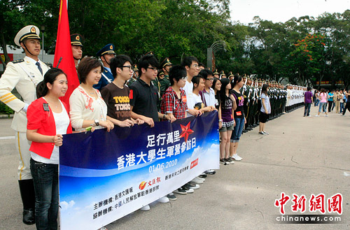 图为学生与驻港部队三军仪仗队合影留念。中新社发 张勤 摄