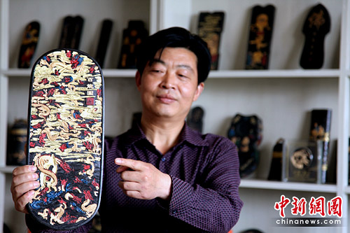 6月3日,歙县徽墨传承人项德胜在展示刚设计创作的“百龙图”,准备送去参加6月18日在福建举办的中国工艺美术百花奖评比。项德胜从小钻研徽墨墨模雕刻,去年徽墨“百佛图”被评为百花金奖,今年有“徽州人家”等两件徽墨作品在世博会安徽园展示。
