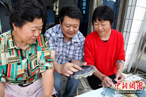 6月3日,歙县砚务中心凌红军与两个姐姐在对歙砚进行打磨。凌红军从事砚雕20年,95年自办家族式歙砚厂,带领姐妹亲戚制作歙砚,并吸收下岗职工和社会闲散人员,年产值近百万,收入可达20万元,工人月收入3500元。像他这样的歙砚家族式厂的在歙县有500多家。