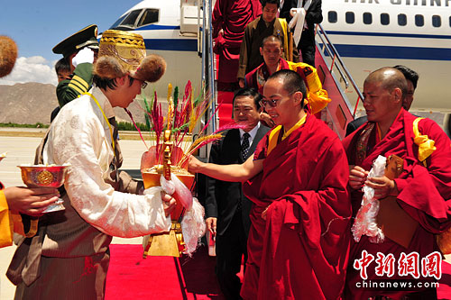 图为西藏民众以切玛欢迎班禅。中新社发 旦增新天 摄