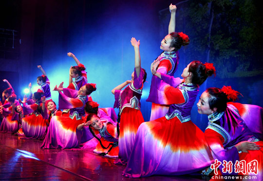 6月17日,内蒙古莫旗乌兰牧骑歌舞团在台北举行《神奇达斡尔》演出记者会,彩排群舞《清水河边的歌声》、鸟春说唱《我的猎鹰》、《达斡尔曲棍球》等节目。中新社发 宋吉河 摄