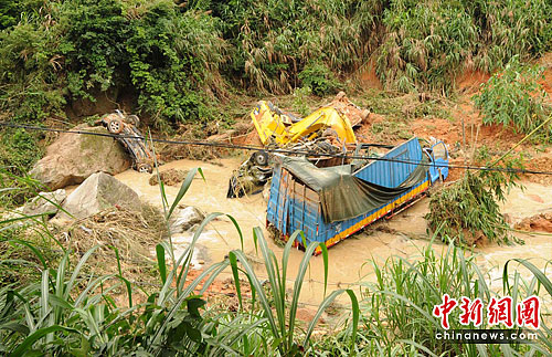 图为南平市一处泥石泥造成多车翻入河底。中新社发 陈泽文 摄
